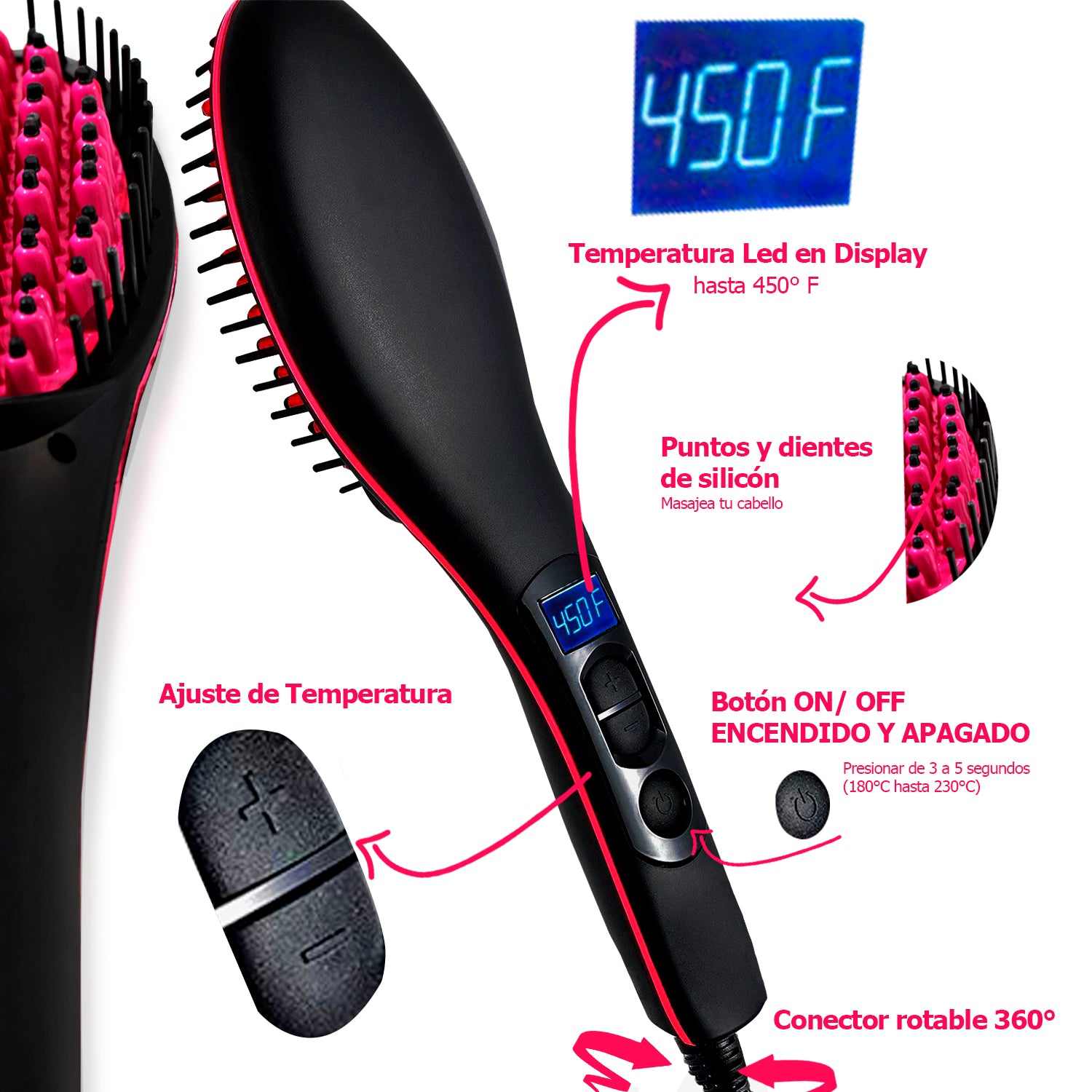 Sabemos que cuidar tu cabello no es tarea fácil , es por eso que te presentamos nuestro Cepillo Eléctrico Fast Hair Strainghtener diseñado con un control de temperatura preciso para garantizar un masaje anti-daño y de contacto caliente , La pantalla digital te muestra la temperatura de calentamiento para obtener el alaciado que deseas rápidamente