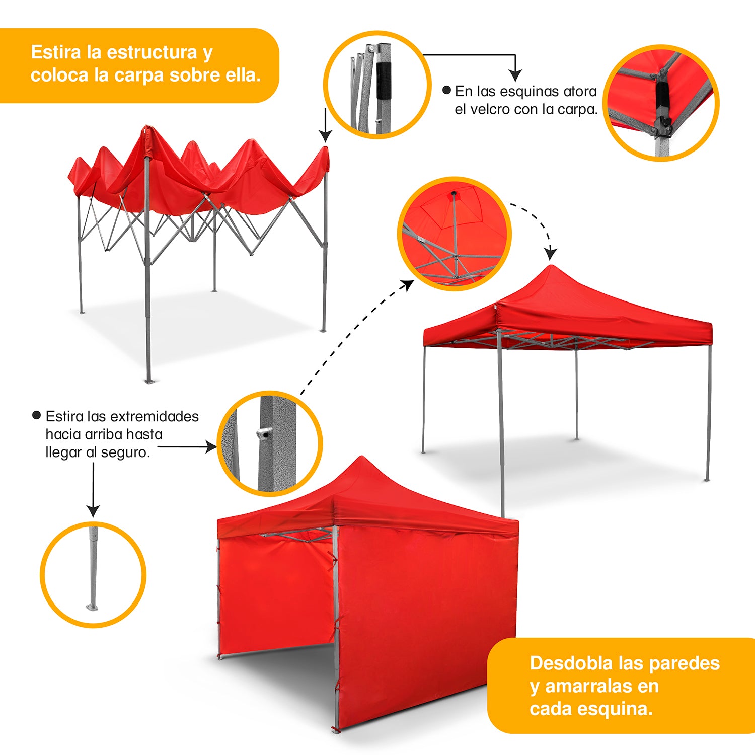Fabricada con estructura metálica resistente, esta carpa ofrece gran durabilidad y soporte. Incluye lona superior impermeable y paredes laterales, perfectas para mayor privacidad, protección contra viento y lluvia,.